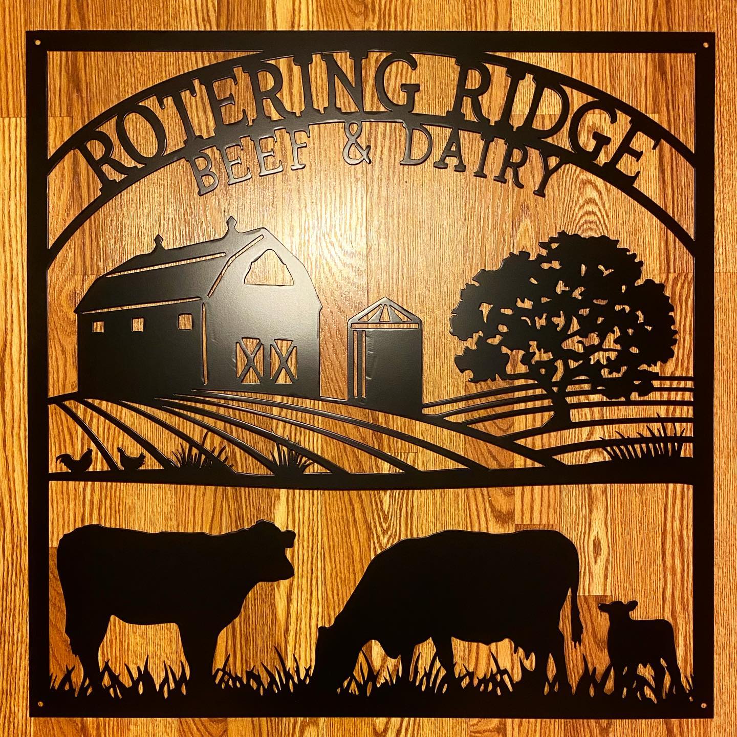 Personalized metal farm or ranch sign featuring beef and dairy cattle.