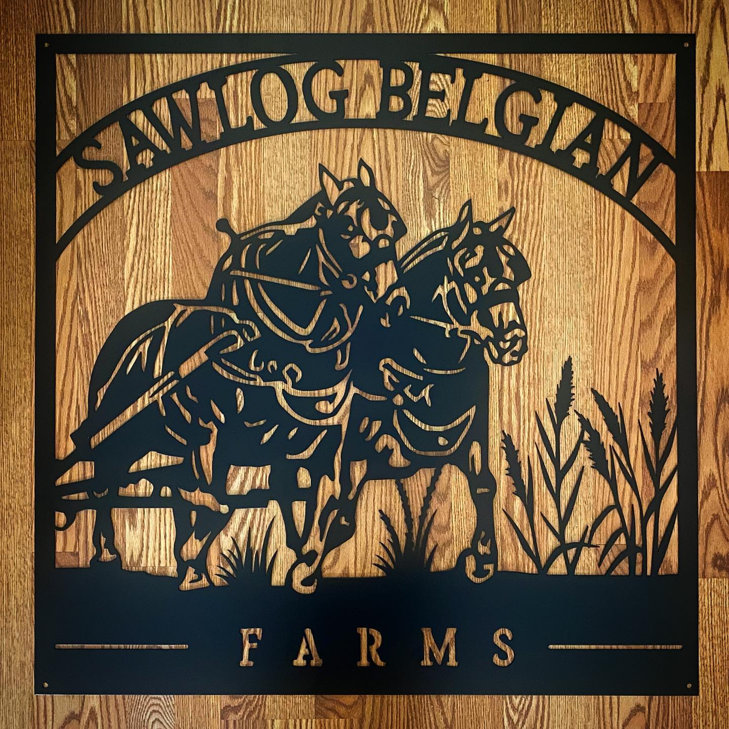 Personalized metal sign featuring belgian horses.